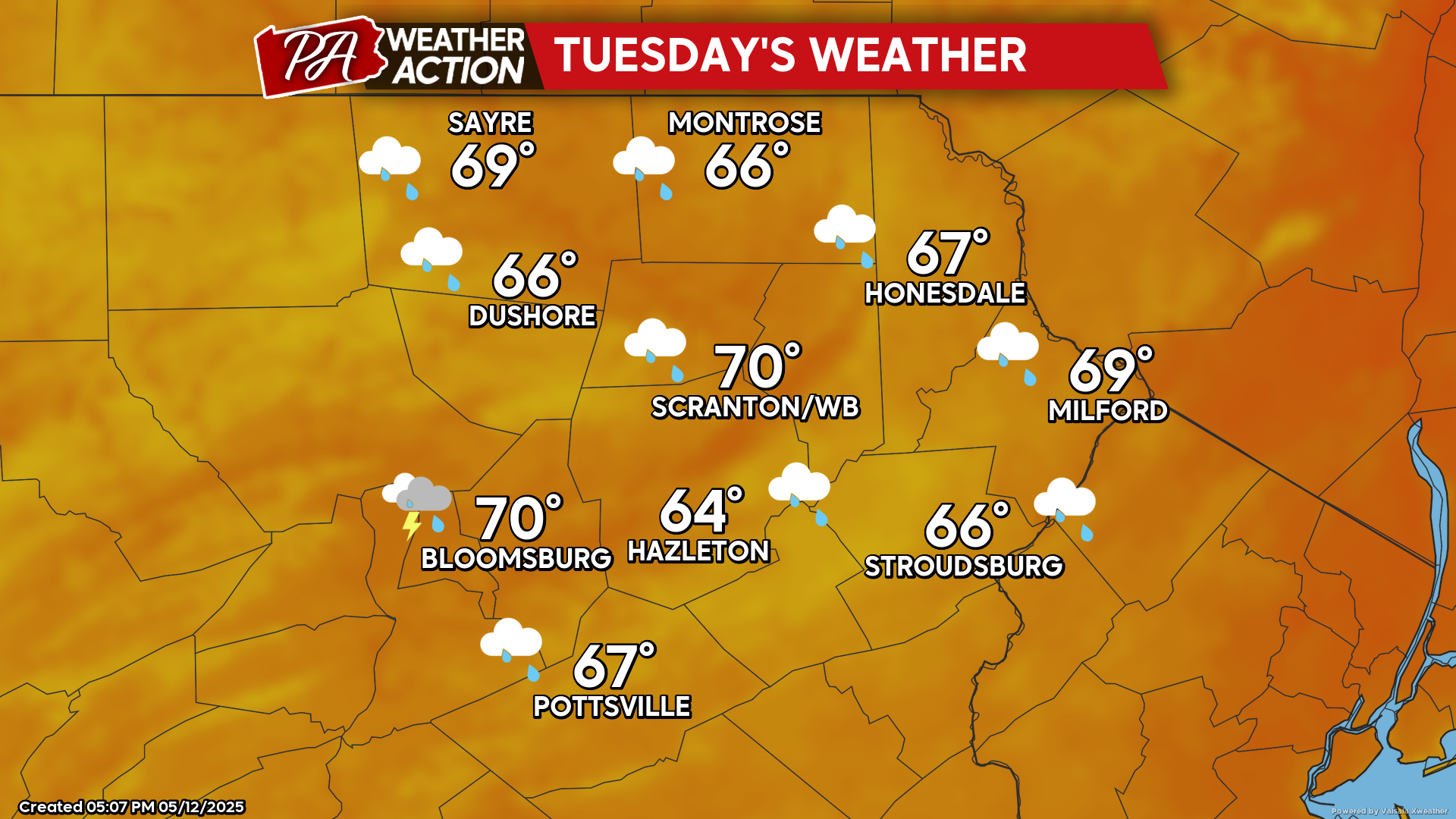 Wednesday will be another wet day with clouds and showers. The breezy conditions will continue with southeast wind gusting 20-30 mph.