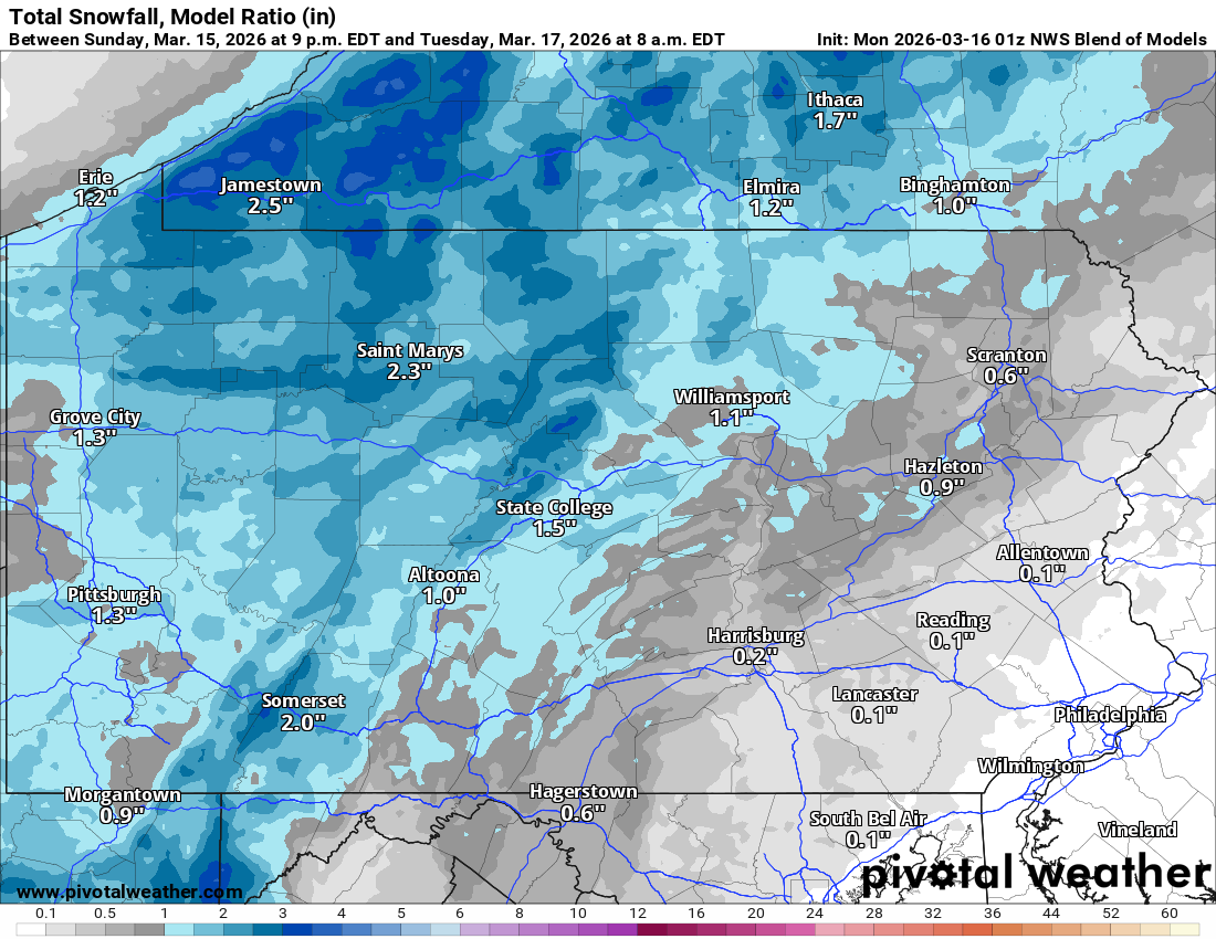 A coating to an inch of snow is likely in Western and Northern PA, with mountain tops and areas near the lake seeing a few inches.