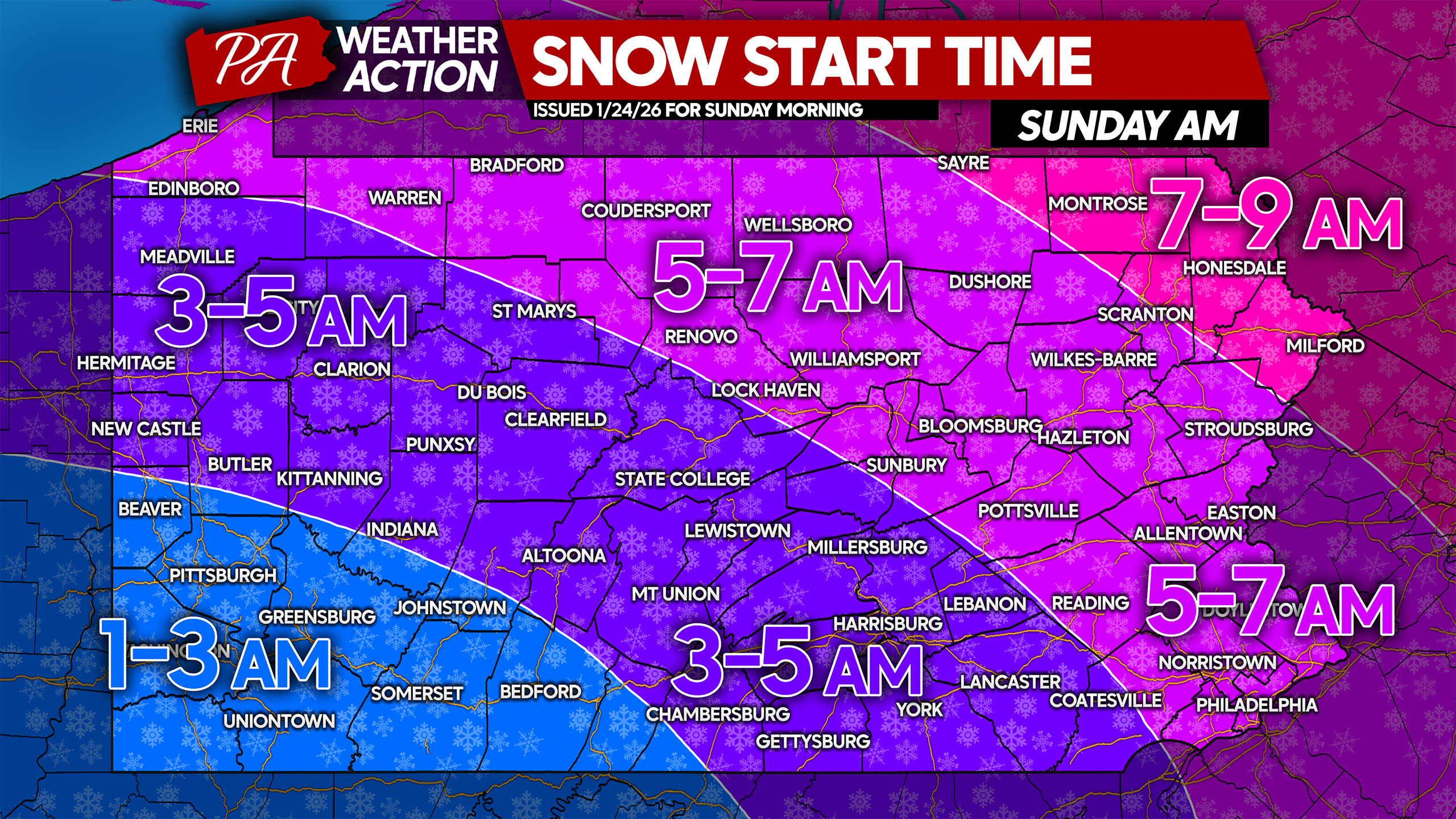 Heading into Sunday afternoon, heavy snow will be dumping at 1″ to locally 2″ per hour in heaviest bands. We will begin to see the sleet line push north across the Southern PA border, especially in South Central and Southeast PA. That sleet line is expected to reach as far north as the PA Turnpike in Central PA and I-78 in Eastern PA.