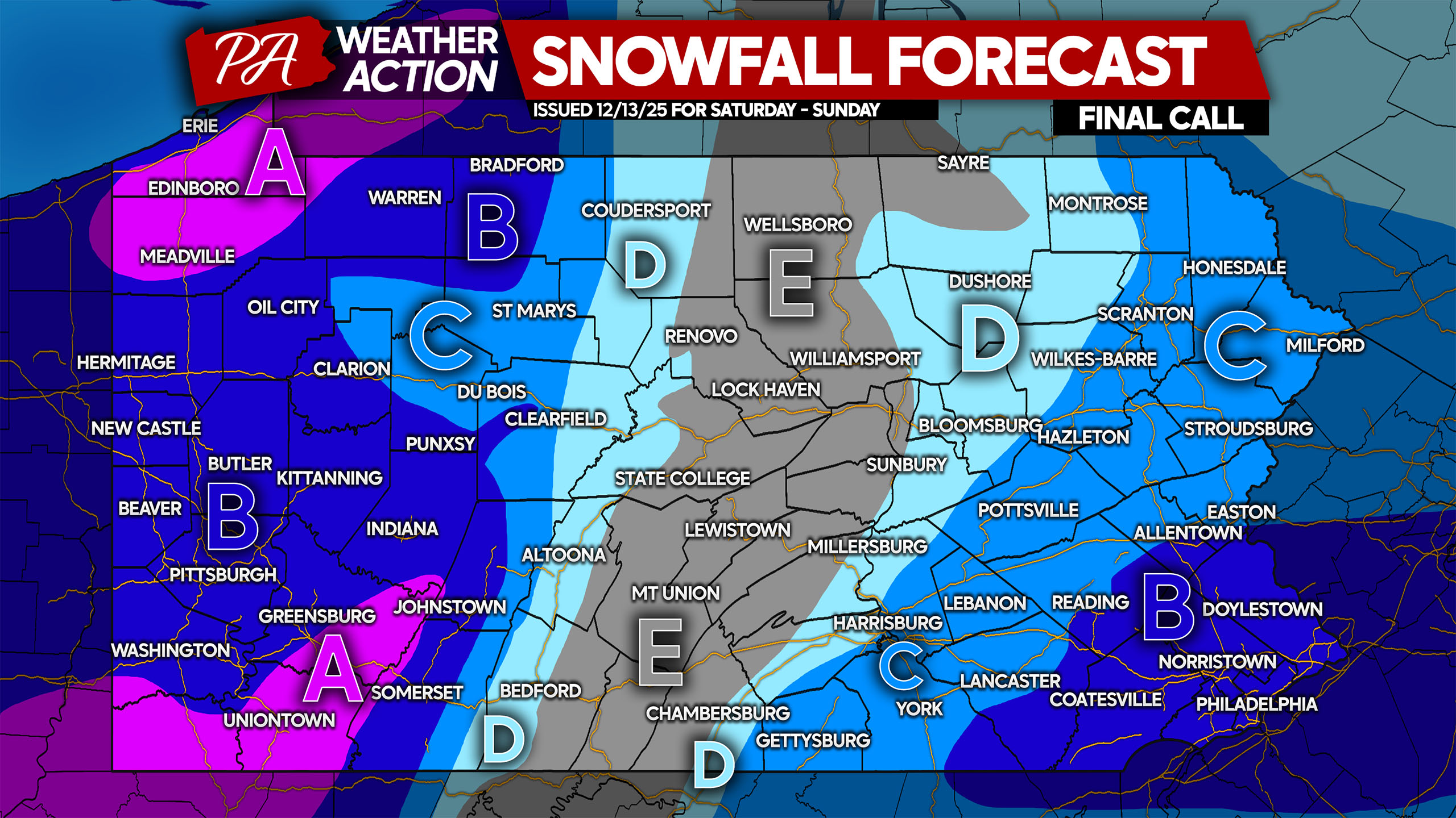 Area B: Snowfall accumulation of 4 – 6″ anticipated. Travel will be impacted this evening in Western PA and Sunday morning in Eastern PA.