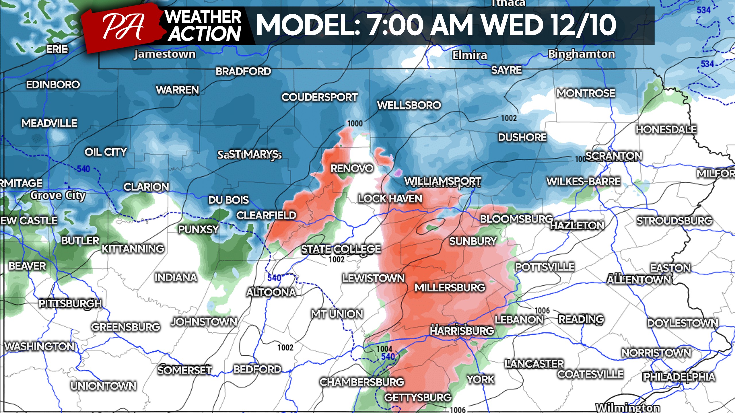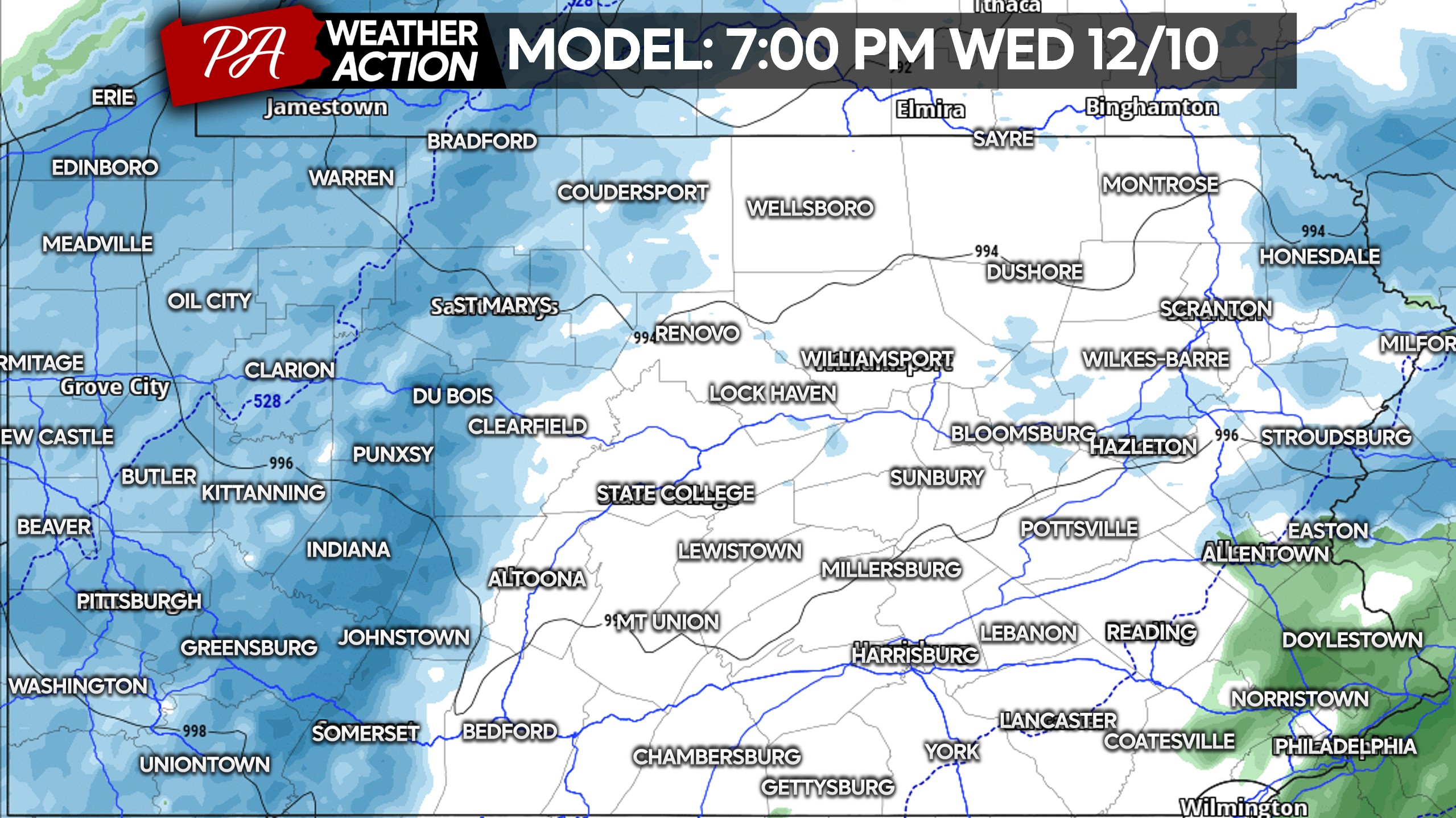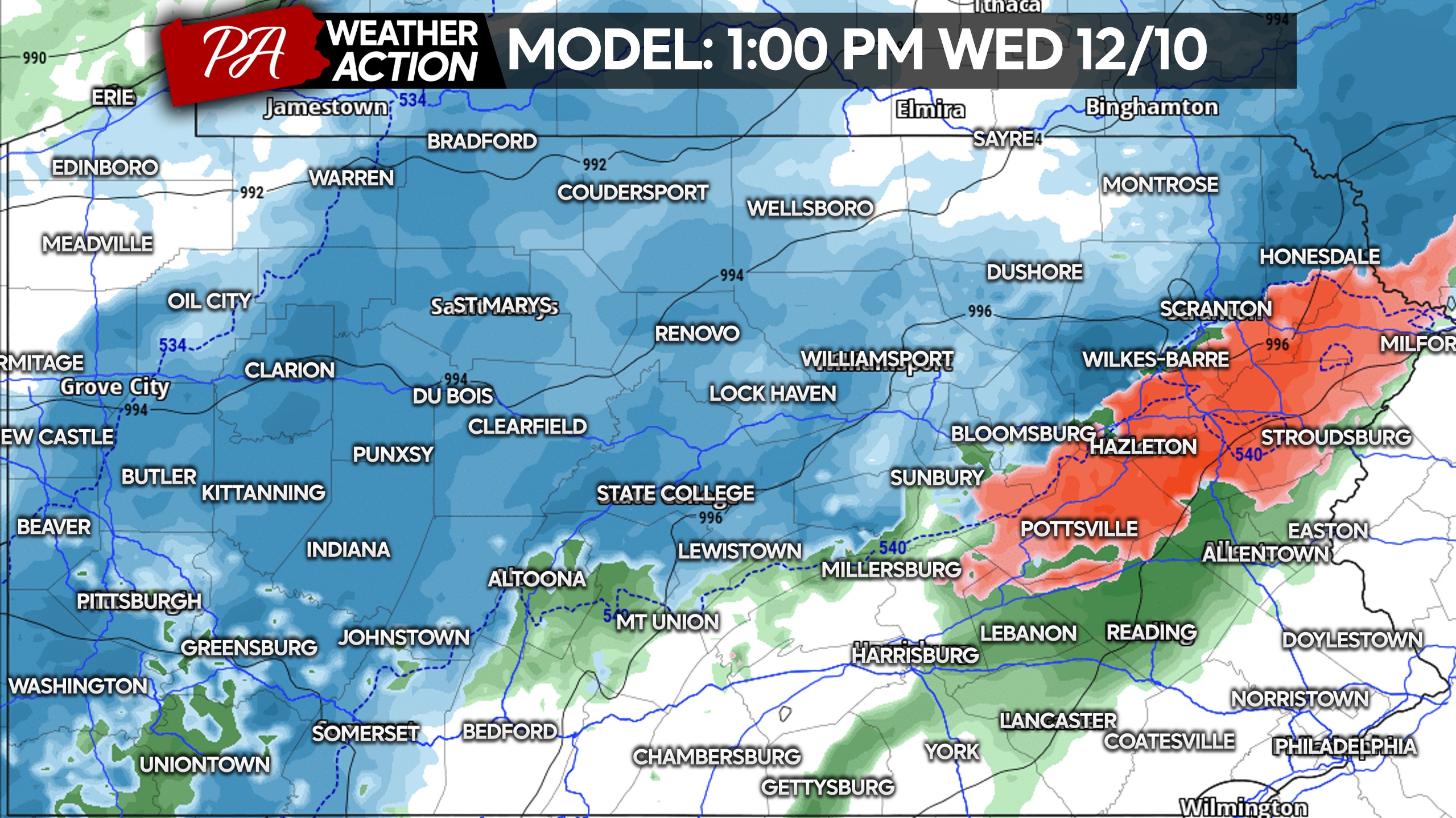 As we hit lunchtime Wednesday, snow will be falling across most of Western and Northern PA. The Poconos will likely start as freezing rain before switching to snow early afternoon. Even northern areas of the Lehigh Valley may switch to snow by the late afternoon.