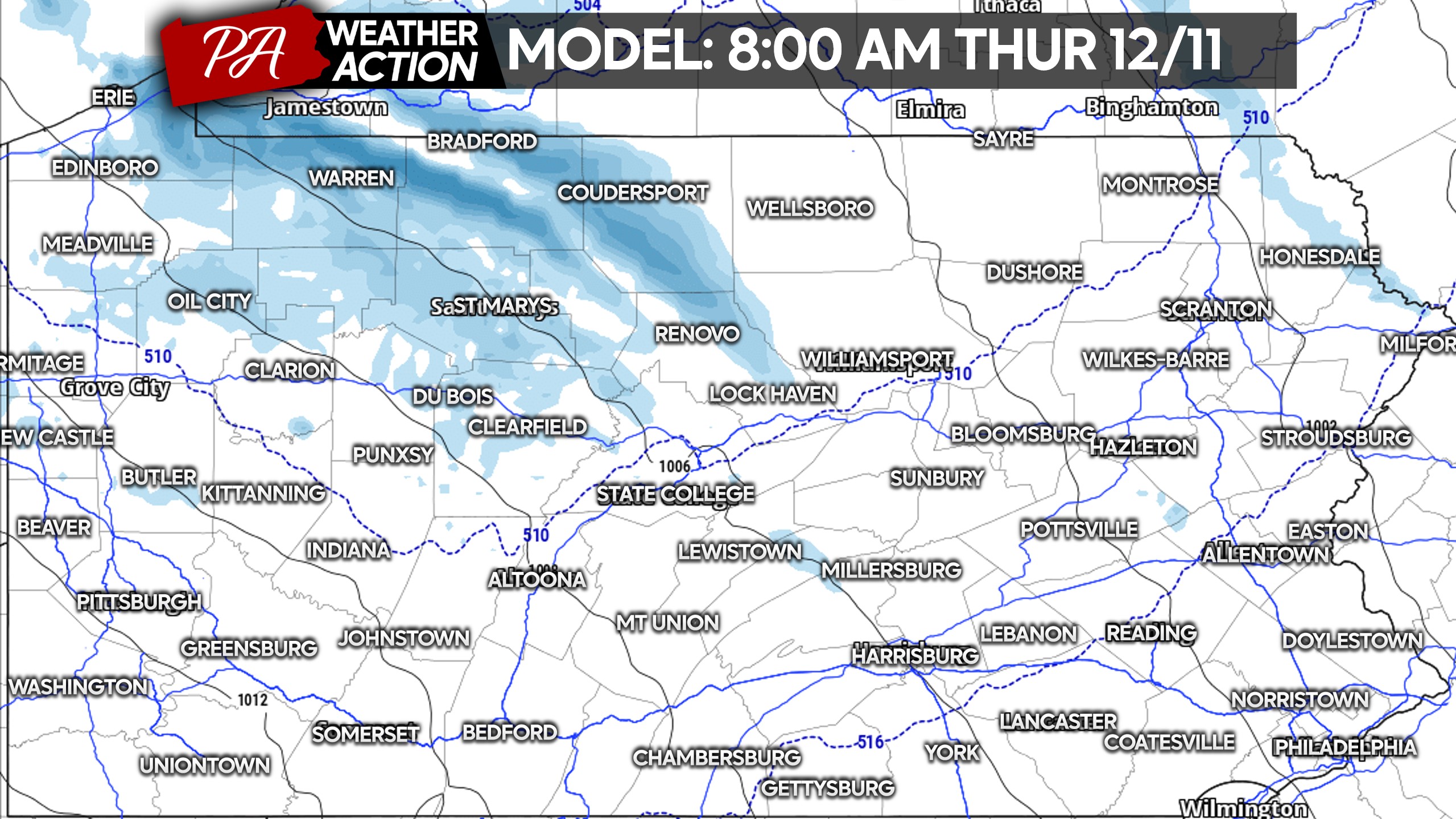 Those widespread snow showers will dissipate early Thursday morning as we switch to lake effect snow squall model. Snow squalls will rage all day across the northwest quarter of the state, occasionally causing issues on I-80 in the usual areas of Central PA.