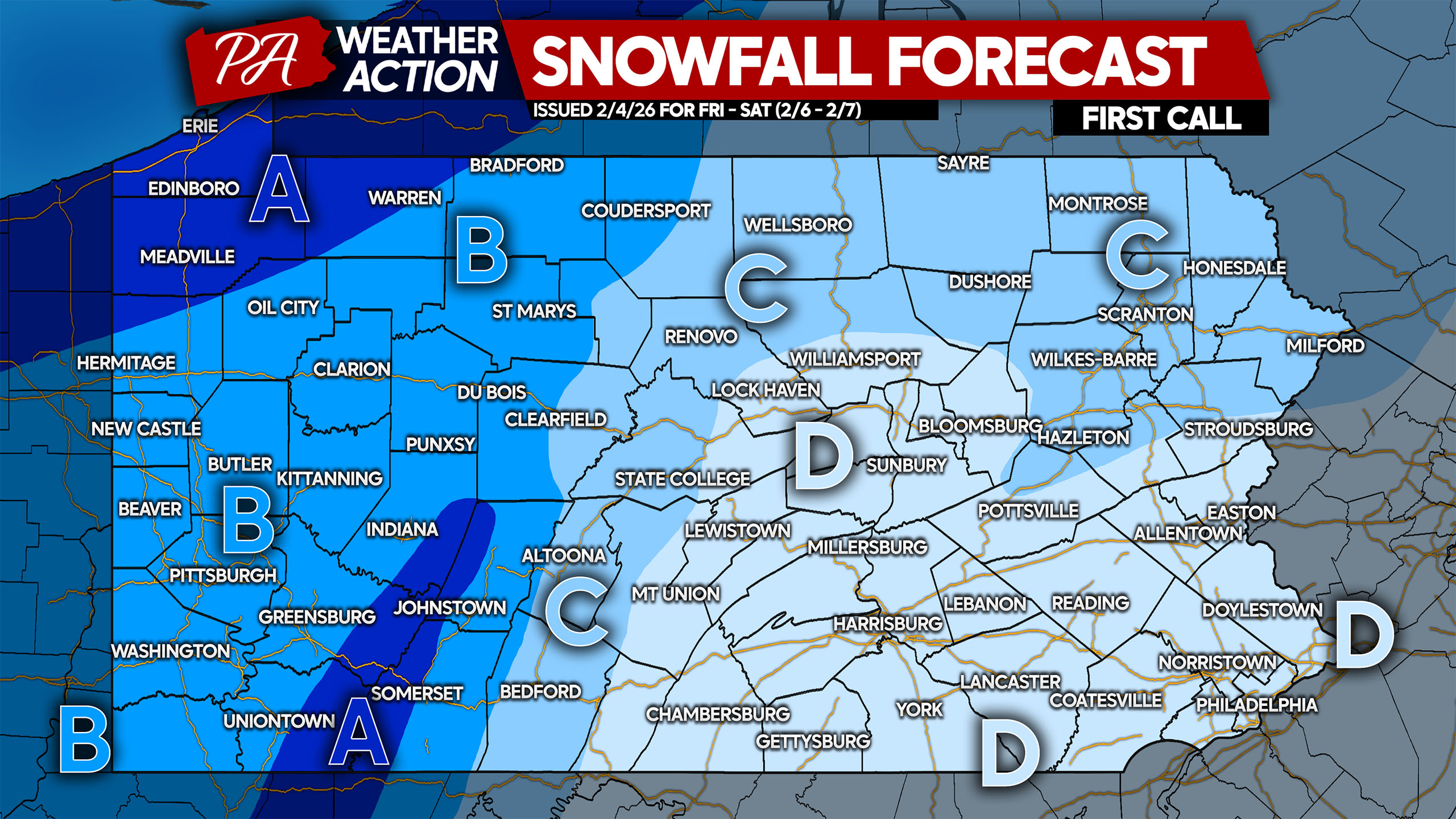 Light snow will begin around sunrise Friday morning in Western PA before slowly making its way into Central PA by the early afternoon. In Eastern PA, patchy light snow will reach the area by dinnertime Friday. Highest snowfall rates will be up to a half-inch per hour in Western PA and a quarter-inch per hour in Central and Eastern PA.