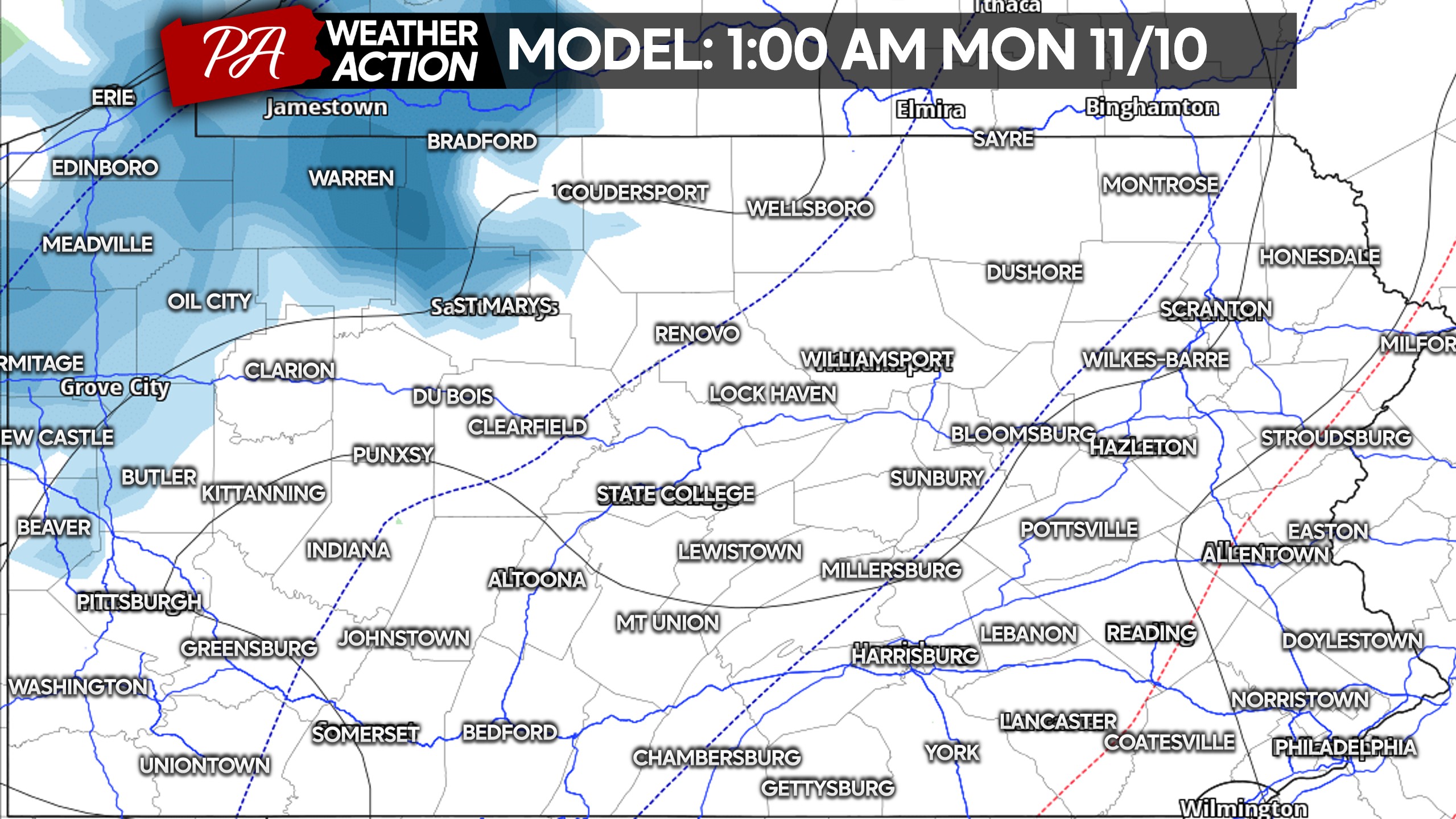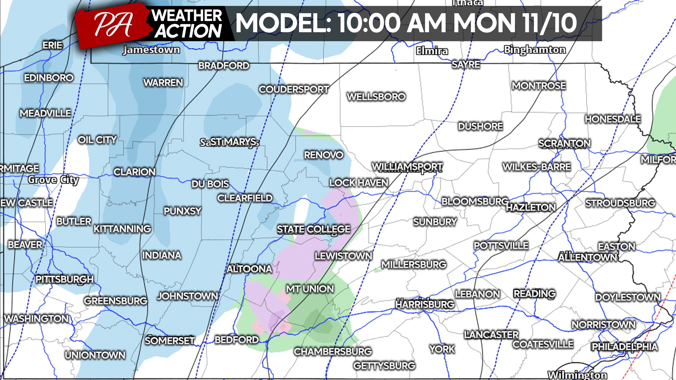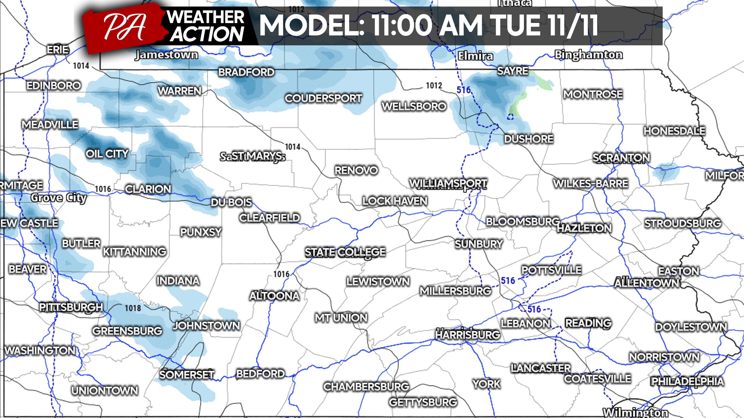 Scattered snow showers will continue through the morning Monday, but none of this should cause slippery travel except in Northwest PA. Below is future radar for 10:00 AM Monday.
