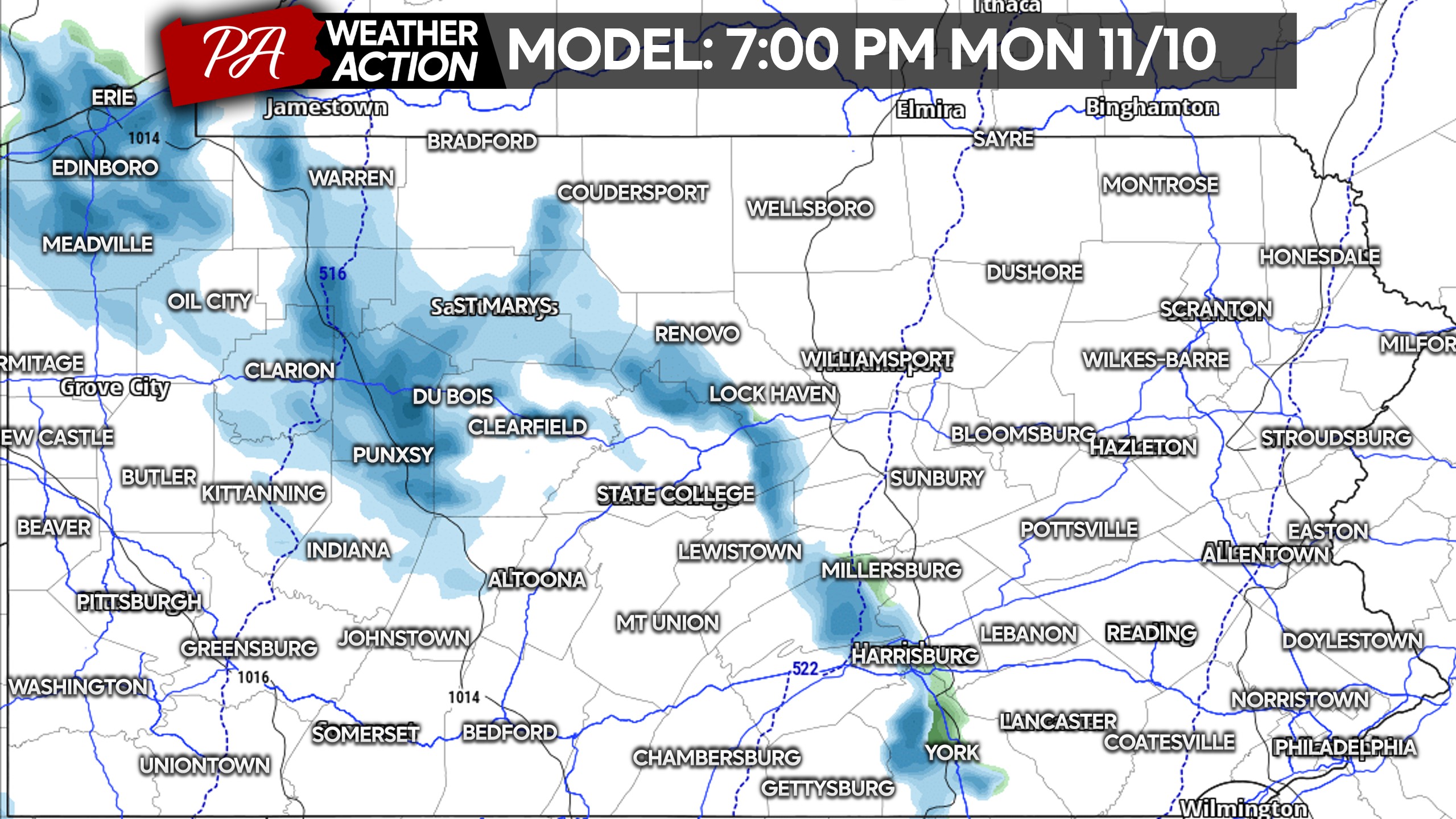 Monday afternoon should bring a lull in the action before lake effect begins to ramp up around dinnertime. The NAM model is bringing a strong snow band through Northwest PA, reaching all the way into the Susquehanna Valley by 7:00 PM Monday.