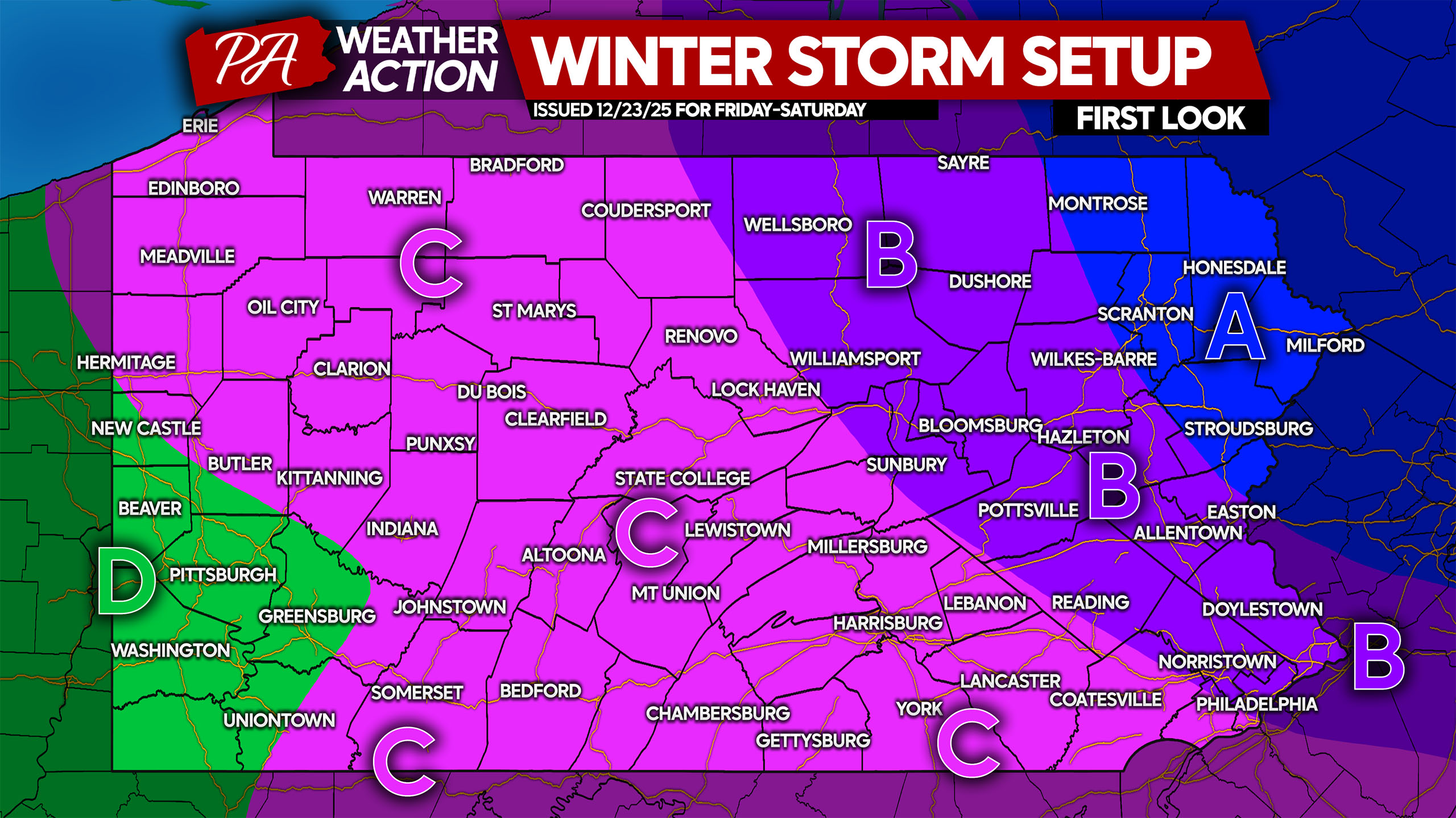 After a very cold first half of December, temperatures have moderated a bit lately with very few people in Pennsylvania on track to see a white Christmas. But we will have a mess on our hands Friday into Saturday morning.