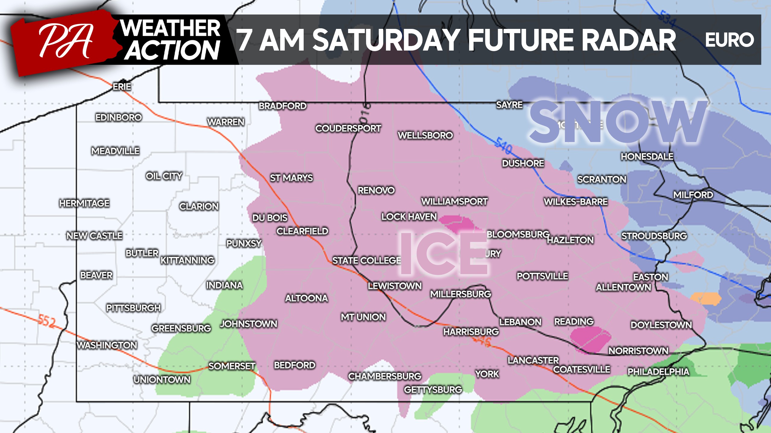 While surface temperatures will be below 32° in most areas, the upper levels a few thousand feet above our head won’t cooperate as much. This will result in widespread sleet and/or freezing rain (ice) in Central and Northwest PA. Only Northeast PA has above a 50% chance of staying all snow.