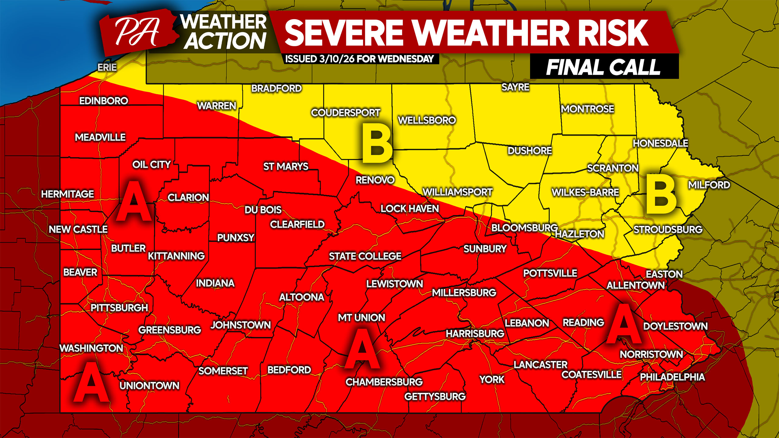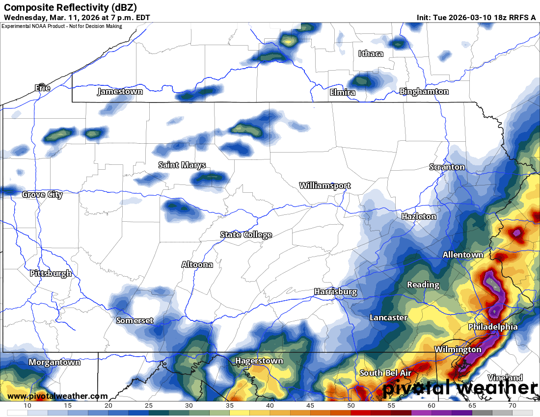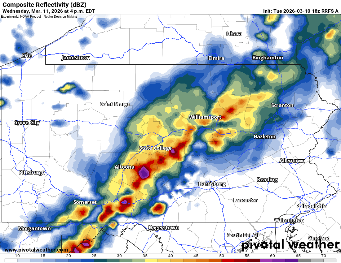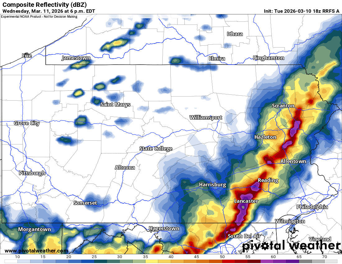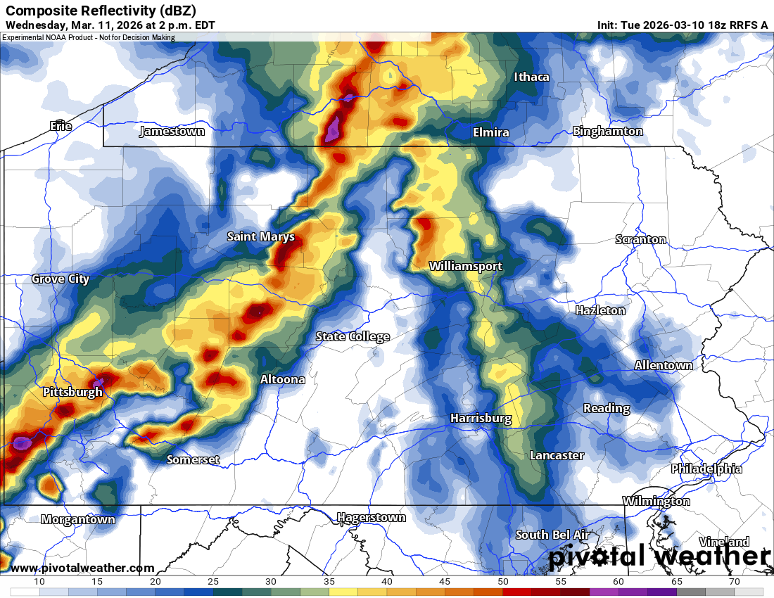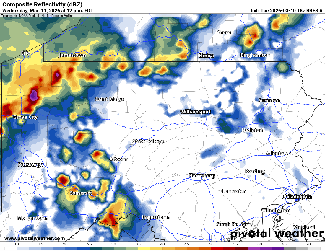 This is shown by the RFRS model, which has a line of strong storms in Northwest PA by noon Wednesday. Meanwhile in Southwest PA, some cells may fire up ahead of the line.