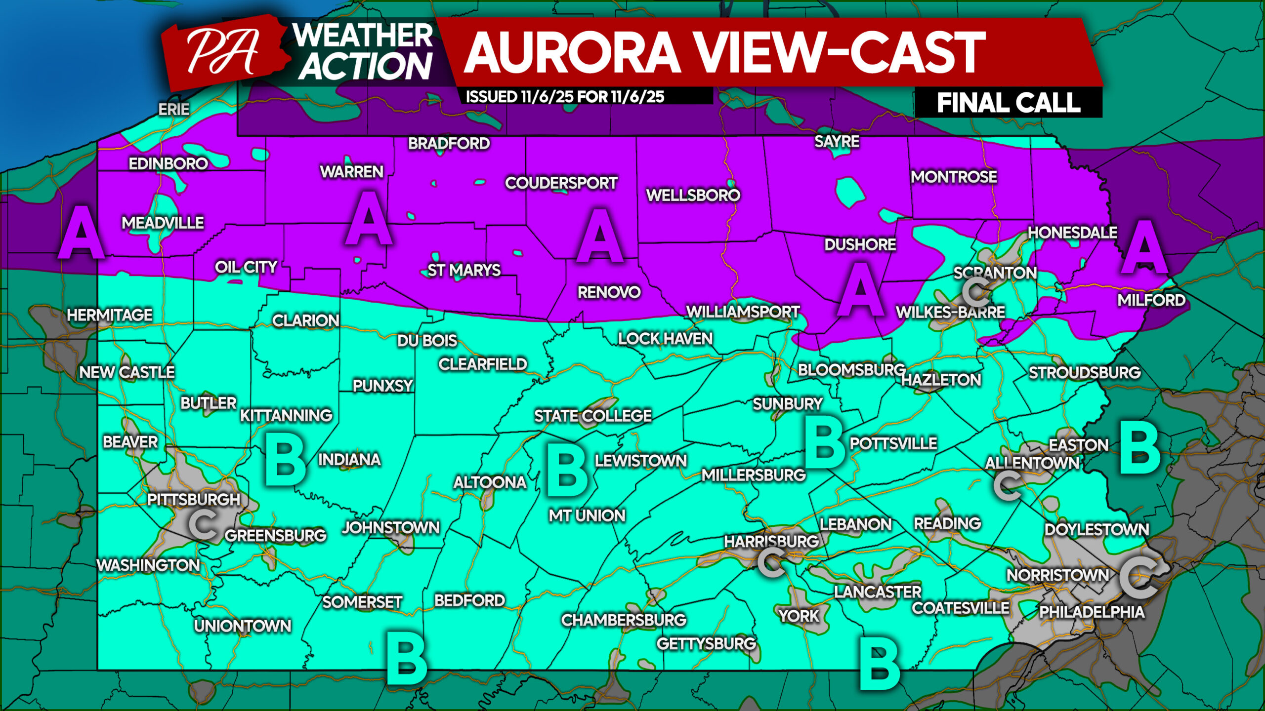 Area A: Light cloud cover, very low light pollution, and increased altitude will give these locations the best chance of viewing vibrant aurora in PA. You may briefly see pillars with the naked eye.