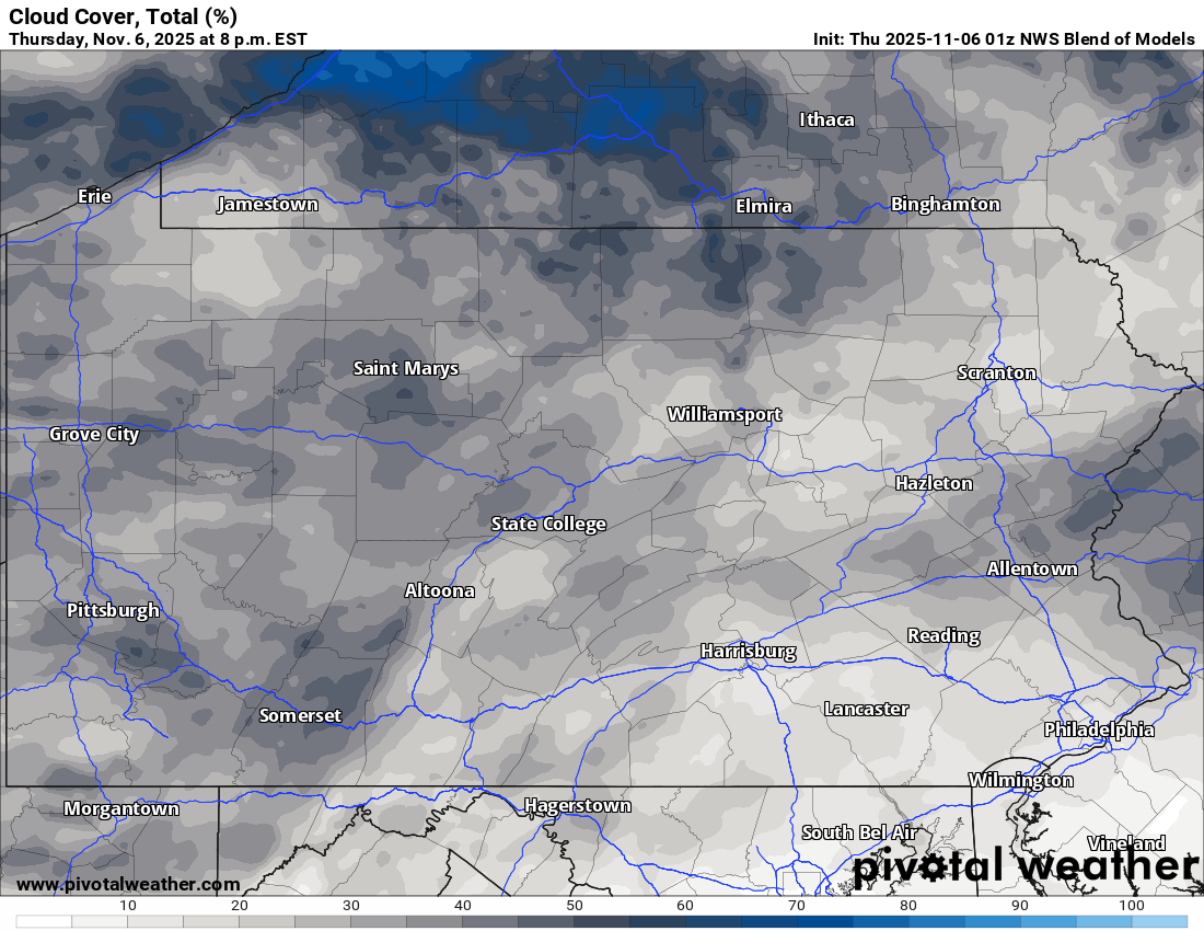 Cloud cover looks to be about 20-40%, with high clouds possible. Below is model blend cloud cover percentage for 8:00 PM Thursday with the key at the bottom.