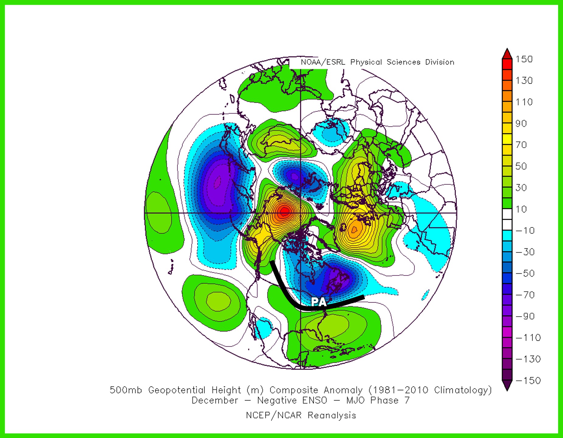 The big question head into December especially in a Weak La Niña will always be the southeast ridge. The SE ridge is an infamous dome of high pressure known to setup on the East Coast, which forces the storm tracking to our west and gives us rainstorms. This phase 7 MJO look keeps the SE ridge somewhat suppressed.
