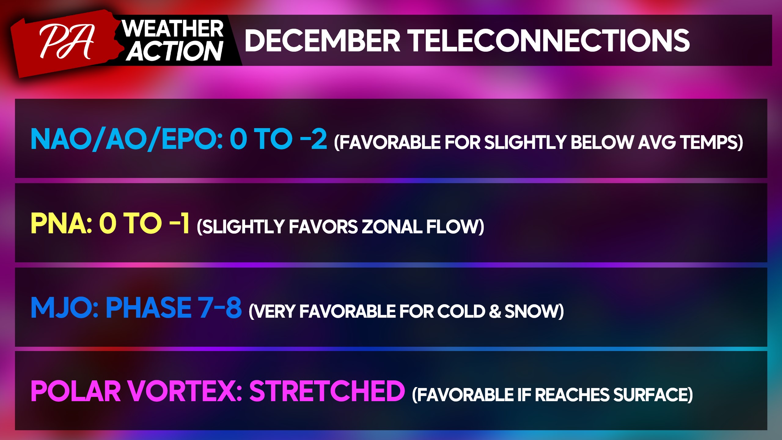 The catch is that we won’t have to rely on the stratospheric warming event for a cold and potentially snowy December. The NAO/AO/EPO look favorable for slightly below average temperatures, with the PNA trying to balance out the jet stream and prevent a large western ridge.