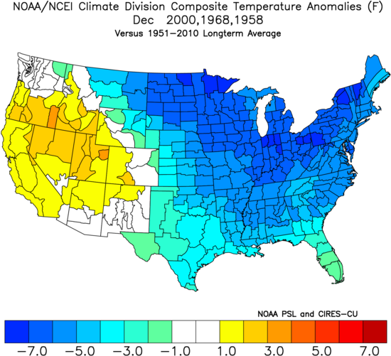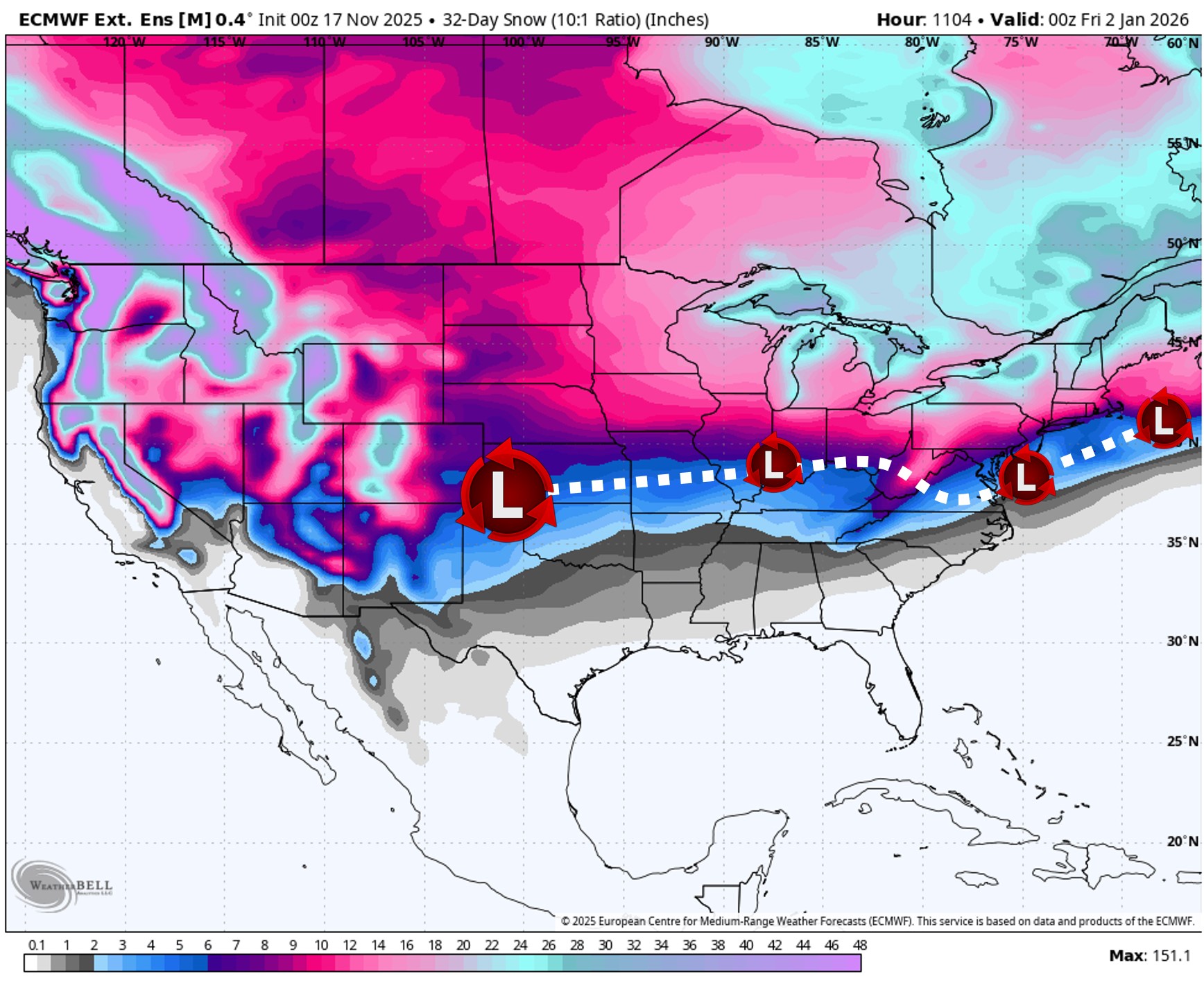This would be a historically-early appearance, only happening in late November a few times in the last 75 years. When it has occurred, this was the outcome. One of those years, 2000, is a top analog for this upcoming Weak La Niña winter.