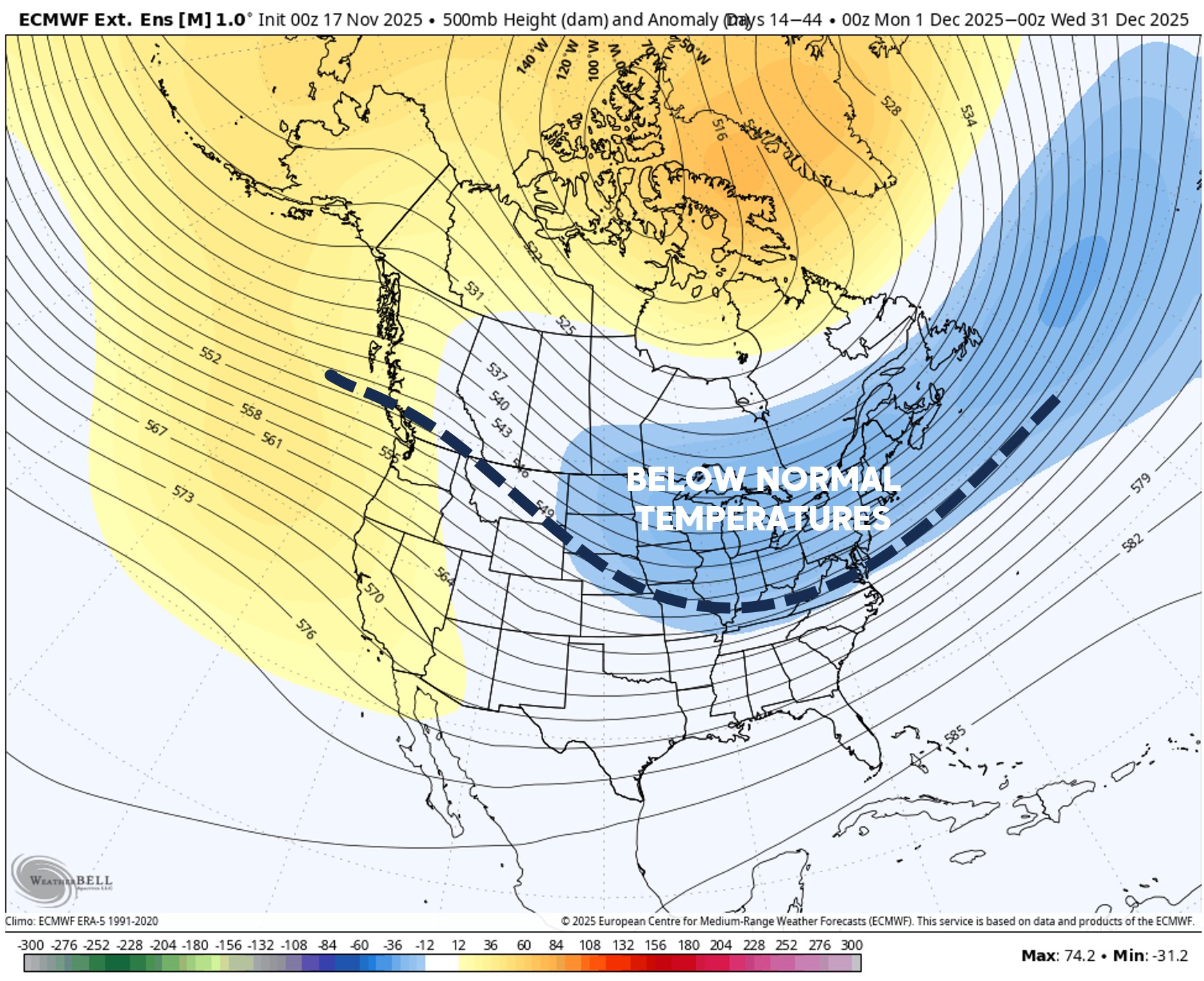 Below is the European model’s projection for month of December, showing a trough setting up from the Northern Plains into the Northeast.
