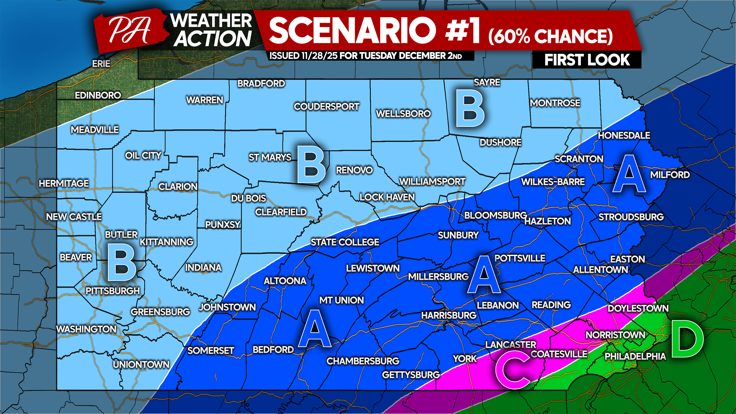 The first widespread winter storm threat of the season is upon us, with the well-advertised cold and potentially stormy December starting with a bang. We are monitoring a winter storm that will begin Tuesday morning, ending early Wednesday morning. Pennsylvania is a large state, and we will have more precise timing info as we near the storm.