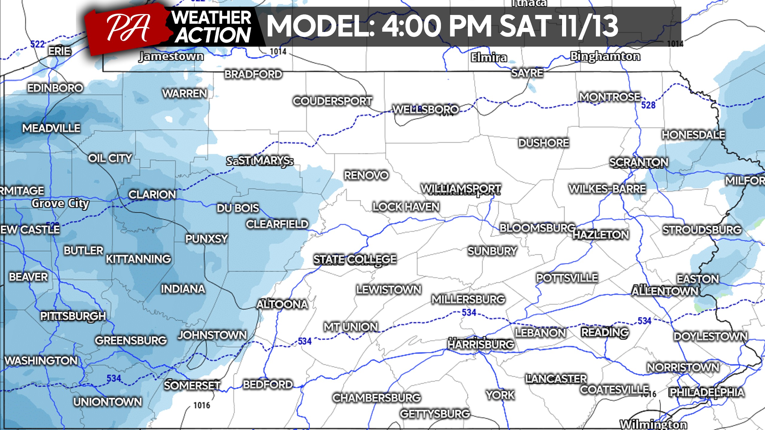 Light snow will begin in Western PA mid-Saturday afternoon. Temperatures in the 20s will mean higher ratio snow, instead of some of the slop we’ve seen recently. Below is the Hi-Res NAM model for 4:00 PM Saturday.