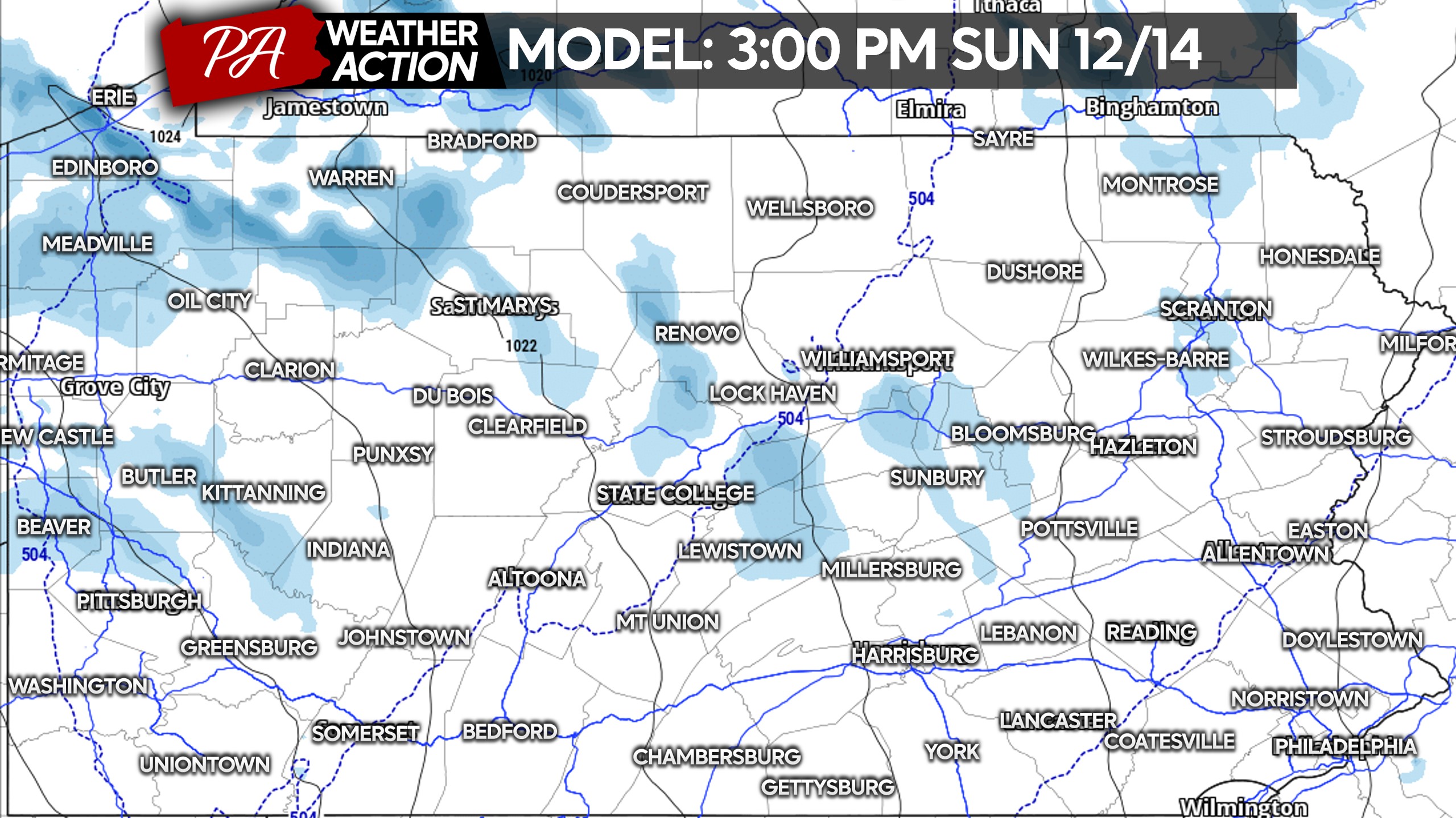 As northwest winds get flowing Sunday, lake effect snow showers and squalls will push in from Lake Erie. These squalls will be most persistent in the lake effect belts of Northwest PA. The lake effect snow should wrap up by late Sunday evening.