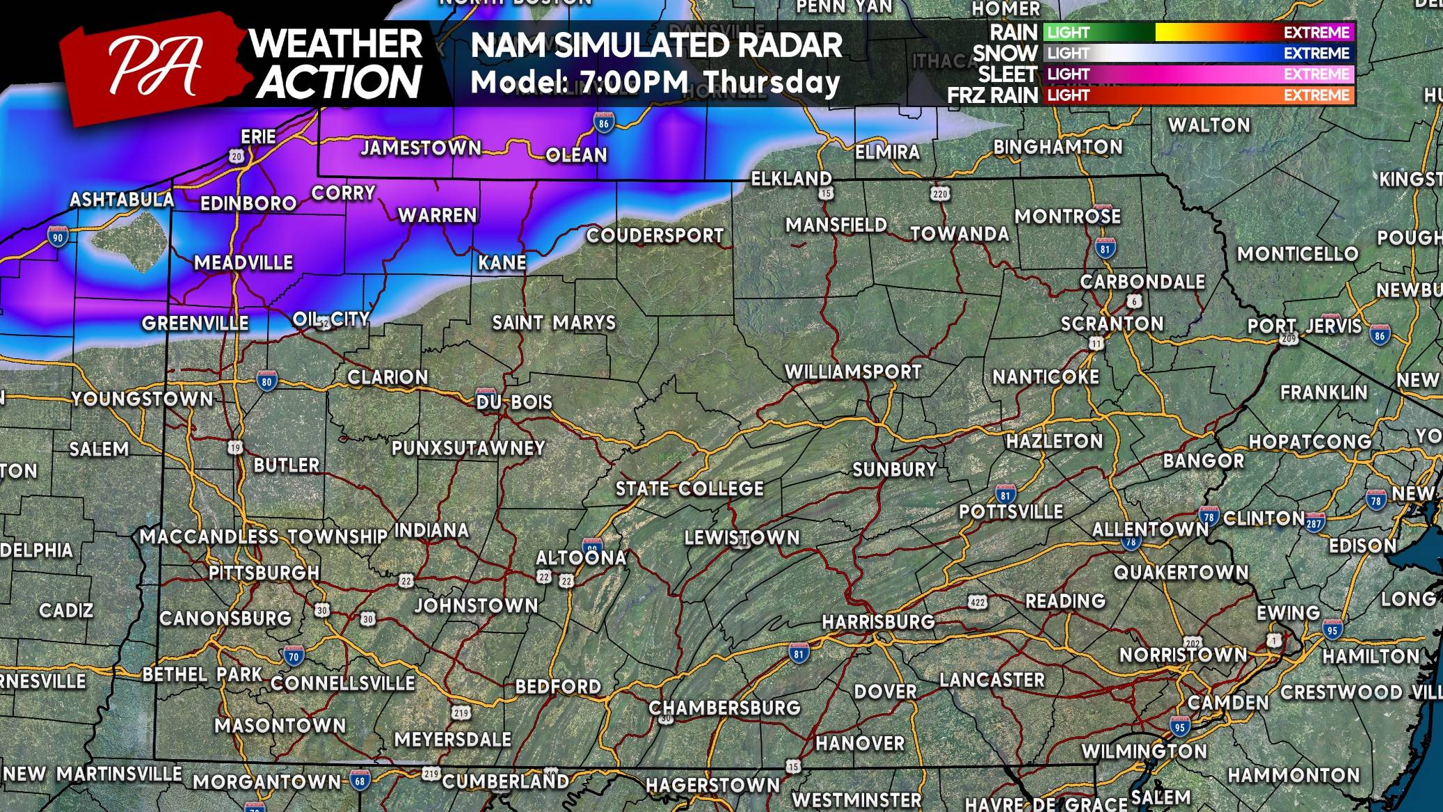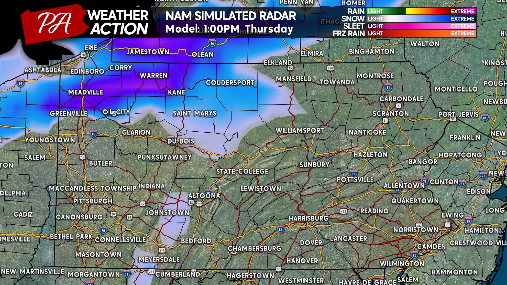 Lake effect snow will get going around noon Thursday in Northwest PA, with some snow showers making it to North Central PA. Bands will moving easterly at this point.