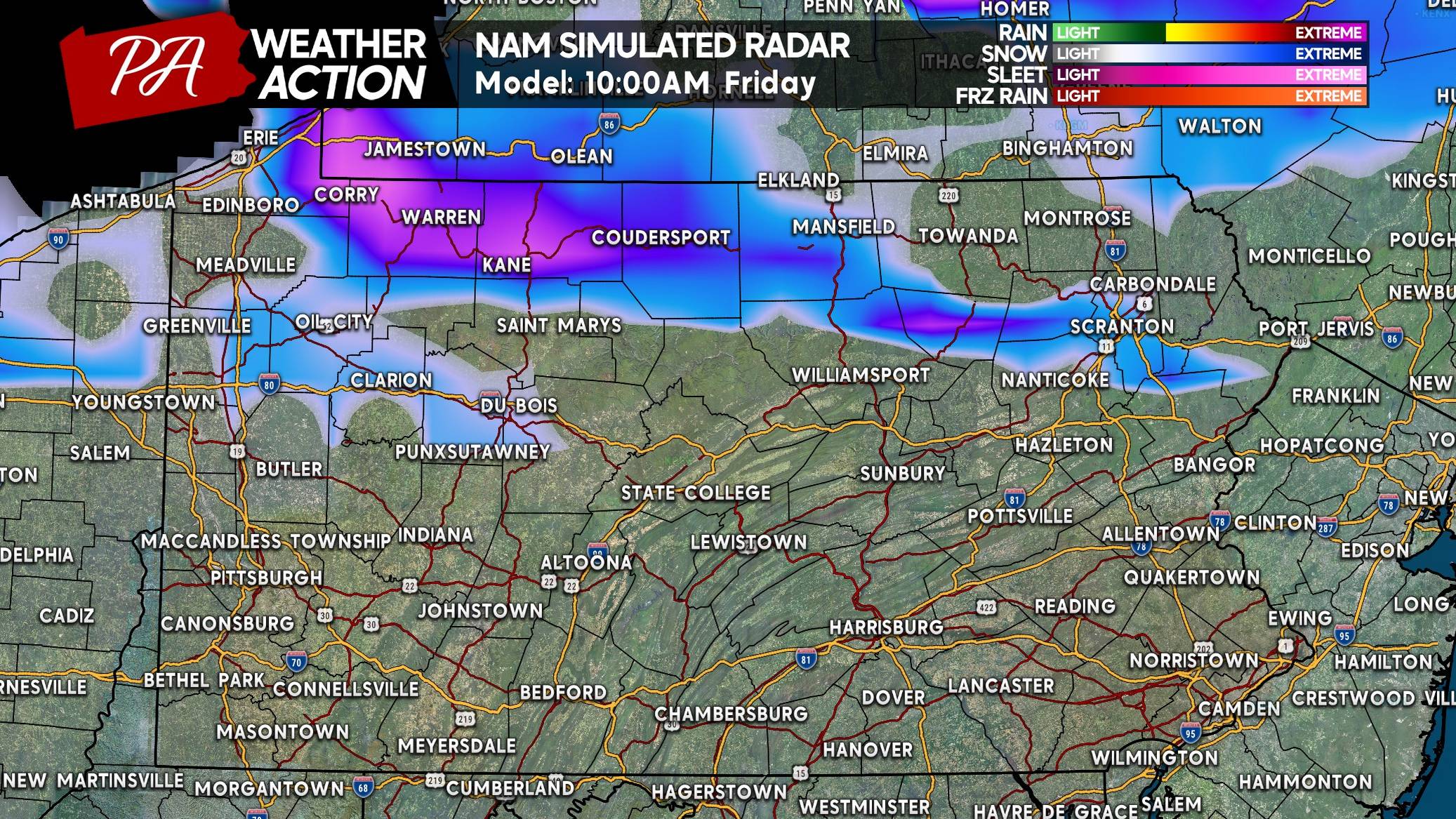 As we go into Friday morning, winds will shift WNW, sending the strongest lake effect bands all the way to the Endless Mountains of NEPA. Much of Route 6 from Tioga to the OH border will be slippery.