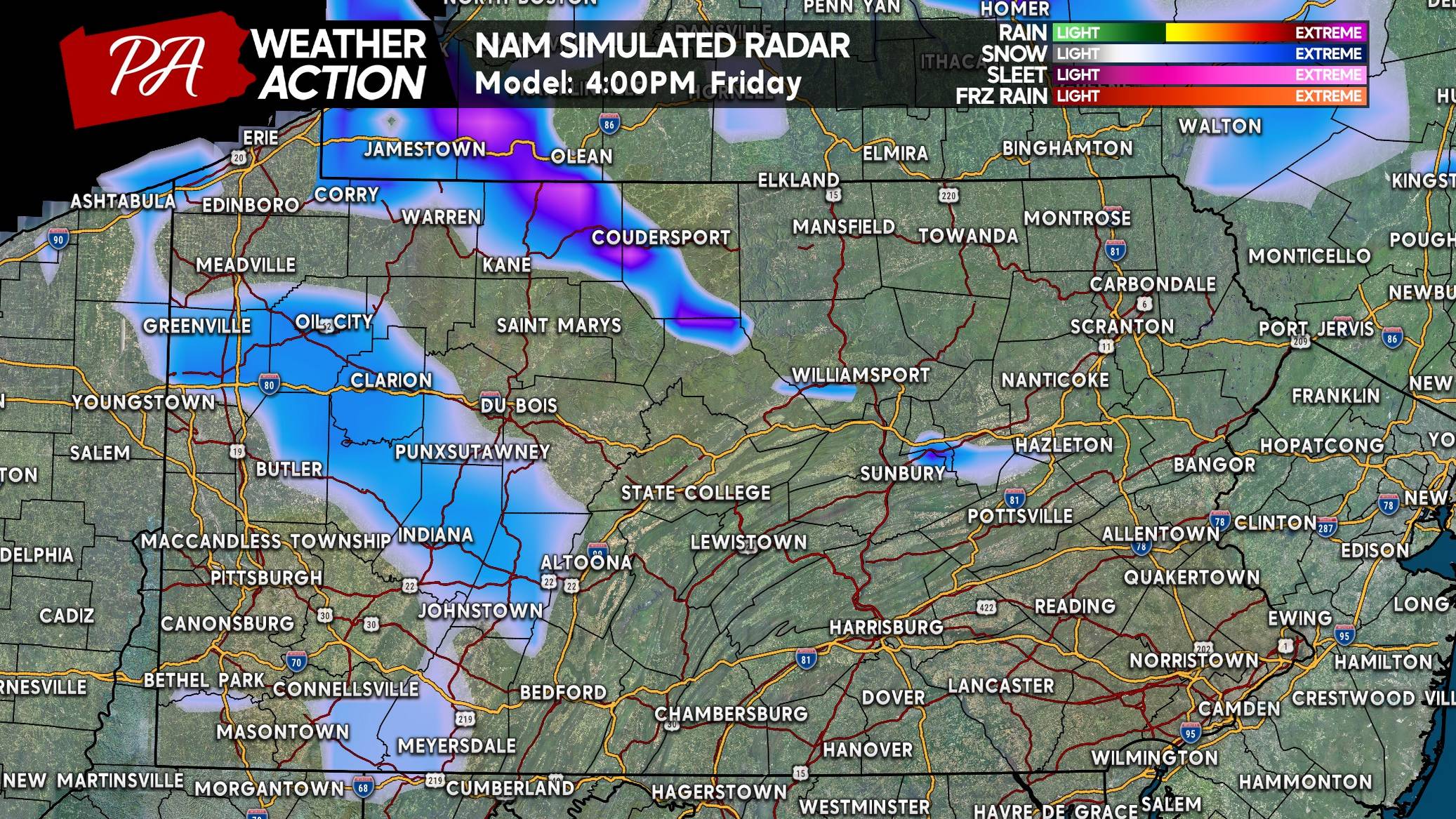 At the tail end of this event, winds will shift northwesterly, meaning snow showers will be possible along US-422 in Western PA and the Laurel Highlands.
